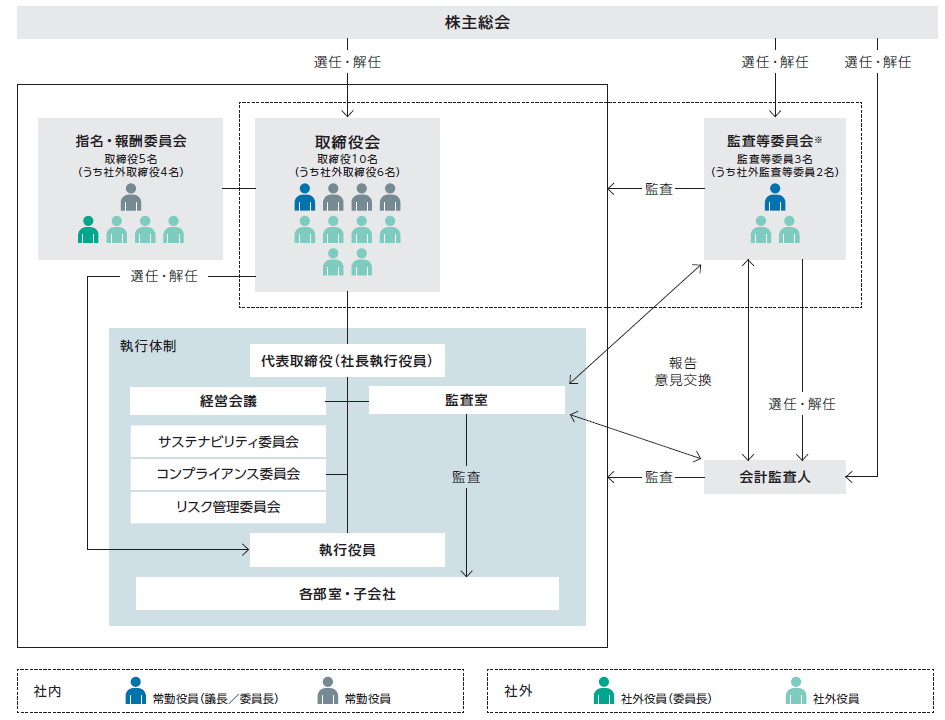 社長を委員長として、サステナビリティ推進室員と各部より任命を受けた委員で構成される。 委員会は定期的に開催され、活動内容を必要に応じて経営会議および取締役会に報告する。 |