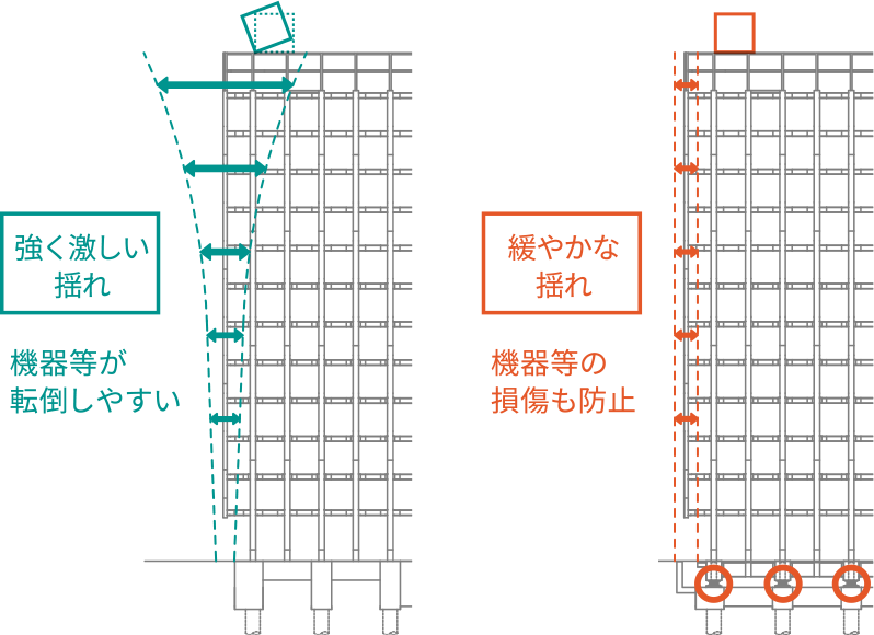 免震構造は一般のビルと比べて上層部の揺れが小さくなる構造です。